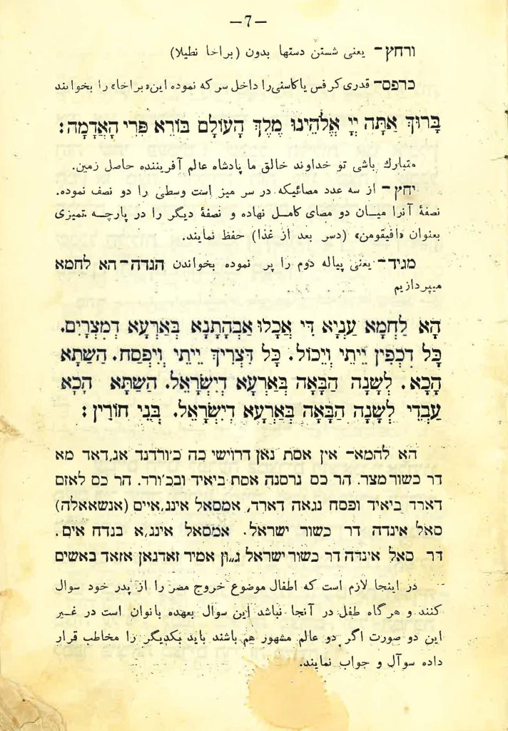 The Judeo-Persian paragraph is the translation of Ha Lachma Anya, printed below the Hebrew. The JP text reads: